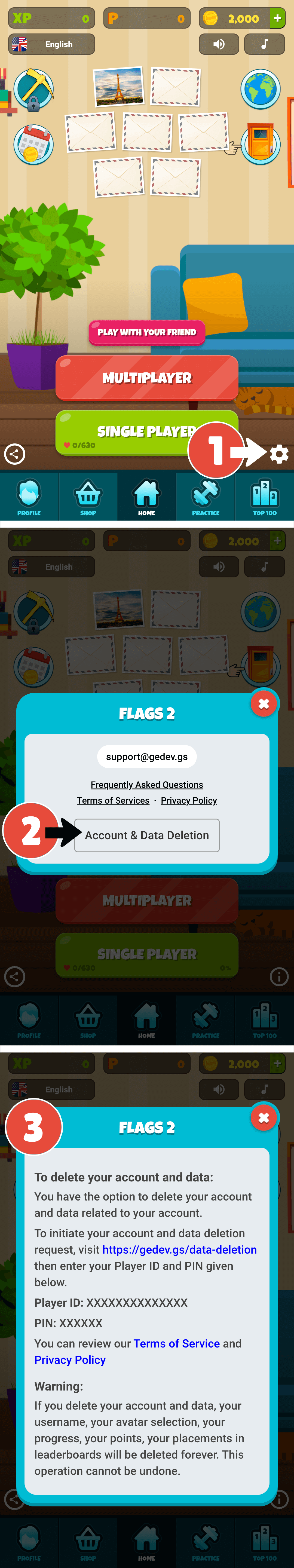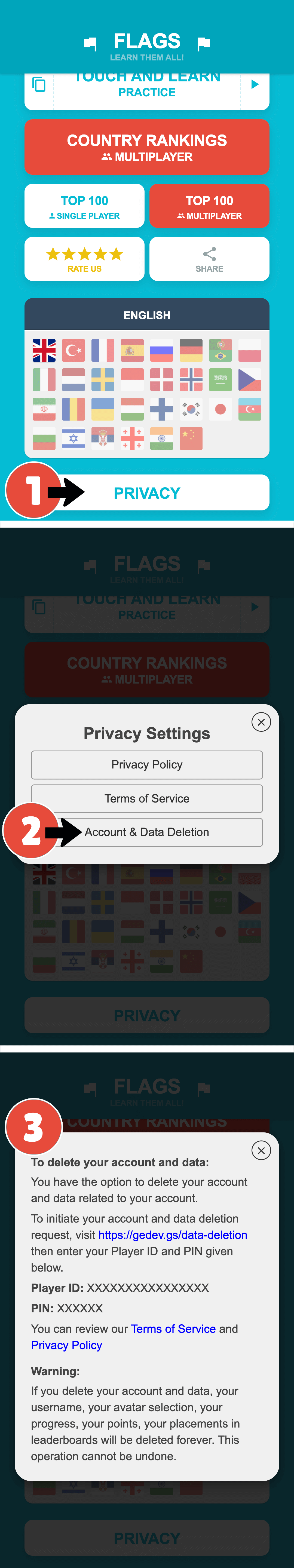 As a player of Flags of the World or Flags 2, you have the right to request a deletion for all information we have about your game account. Please be aware that removing your game account information will also remove all of the information we have collected about it, including any achievements.